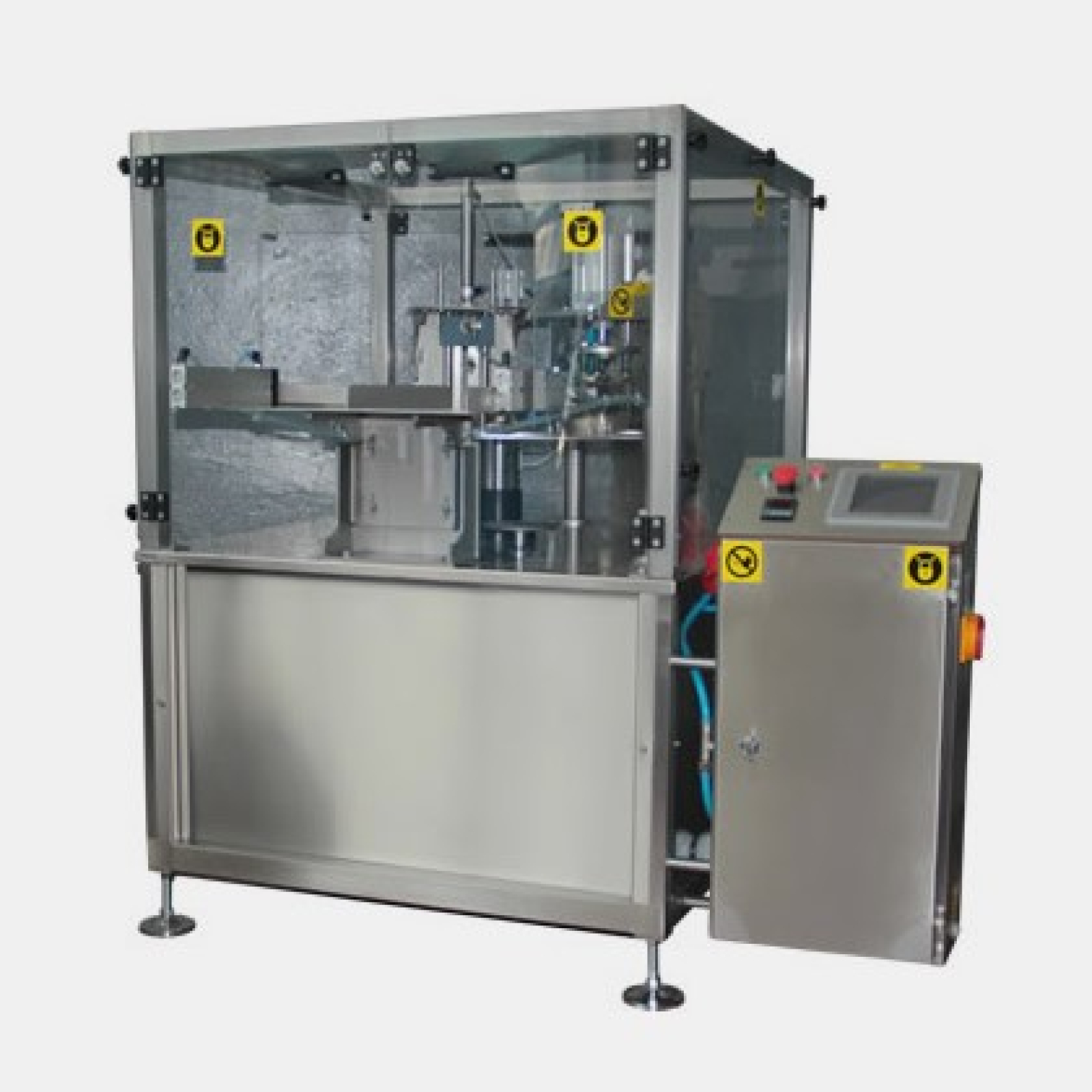 Makinamız PLC Programlı, Dokunmatik Ekranlı ve İki Zamanlı Hız Ayarlıdır. Kaymaklı yoğurt kasesini otomatik olarak hazneye alır, üzerine folya koyar ve ısı ile yapıştırır. İşlemi bitmiş kaseyi toplama istasyonuna dizer.